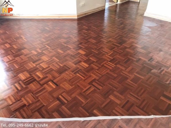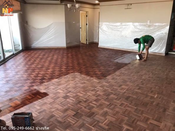 งานขัดพื้นไม้โมเสค พื้นที่ 150 ตรม ทาเคลือบสีกึ่งเงา กึ่งด้าน ลูกค้าตรวจงานเรียบร้อยครับ 💯% ทุกผลงาน